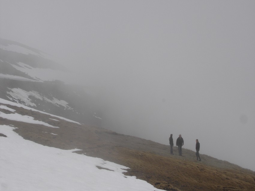 Nur langsam schwindet der aufsteigende Bodennebel und gibt ab und zu schon einmal einen kurzen verschwommenen Blick ins Tal frei. In diese Wolken- oder Nebellöcher wollen wir hinein starten ? |