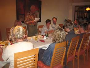Im Hotel hat man inzwischen für uns eine lange Tafel hergerichtet. So sitzen wir alle an einem Tisch. Die Predigt der Pastors am Morgen veranlasst mich, diese biblische Geschichte einmal in Platt vorzutragen, so wie sie sich angeblich in Hesselbach abgespielt hat. Ob alle dies und auch weitere Gedichte in der hessischen Mundart verstanden haben bleibt zu hoffen. Die Sitzung endet zeitig, denn alles geht recht früh in die Falle. Angeführt von Hermann und Inge. |