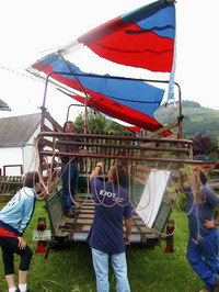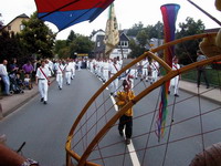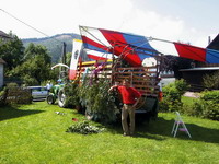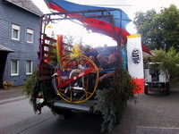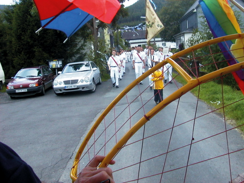 war. Am Sonntagmorgen fand dann unter freiem Himmel ein Festgottesdienst auf dem Kirchplatz statt. Viele andächtige Besucher lauschten den Worten von Pfarrer Krämer. Anschließend ging es zum traditionellen Frühschoppen. Gegen 14:00 Uhr war dann unser Auftritt mit dem Festwagen an der Reihe. Vorsichtig stellten wir uns auf dem geplanten Platz auf. Bis jetzt waren wir noch nicht mit unserem großen, sperrigen Gefährt hängen geblieben und um die schmalen Kurven waren wir auch gut herumgekommen. Frank kam mit einem Kasten Bier zur Erfrischung der auf dem Wagen mitfahrenden Flieger. Jürgen kam mit seiner Tochter Anna, die einen ganz großen Eimer Bonbons dabei hatte, welche den zuschauenden Kindern zugeworfen werden sollten. Hermann brachte zum Abschluss noch seinen Rucksackmotor mit, welcher am hinteren Ende des Wagens postiert wurde. Wir waren startklar. Inzwischen hatten sich jede Menge andere Motivwagen eingefunden. Über 20 Gruppen und Vereine stellten sich dar. So auch die Ski-Freunde, welche an diesem schönen Sommertag sogar den Winter herbeigeholt hatten. Viele Burschen- und Mädchenschaften aus den umliegenden Ortschaften hatten sich ganz in Weiß gekleidet eingefunden. An der Spitze des Festzuges gab das Tambourcorps Bad Laasphe den Takt zum marschieren an. Pünktlich um 14:00 Uhr setzte sich der Festzug wie ein langer bunter Lindwurm in Bewegung und schlängelte sich durch die engen Straßen und Gassen Niederlaasphes. An den Straßenrändern hatten sich viele Besucher und Gäste versammelt, die sich dieses seltene Schauspiel nicht entgehen lassen wollten. Schließlich kamen wir auf dem Festplatz neben der Lahn an, brachten Wolfram den Wagen zurück, bauten schnell ab und versammelten uns wieder im Festzelt. “Die Original Bessenbachtaler” übernahmen noch einmal das musikalische Zepter und sorgten für Stimmung. Das Festzelt war brechend voll. Es wurde wieder viel getanzt und gefeiert. Am Montag dann fand noch einmal ein zünftiger Frühschoppen statt, der von den “Lahntalmusikanten” mitgestaltet wurde. Für uns Drachen- und Gleitschirmflieger Bad Laasphe war es ein aufregendes und ereignisreiches Festwochenende, das uns viel Spaß gemacht hat. |