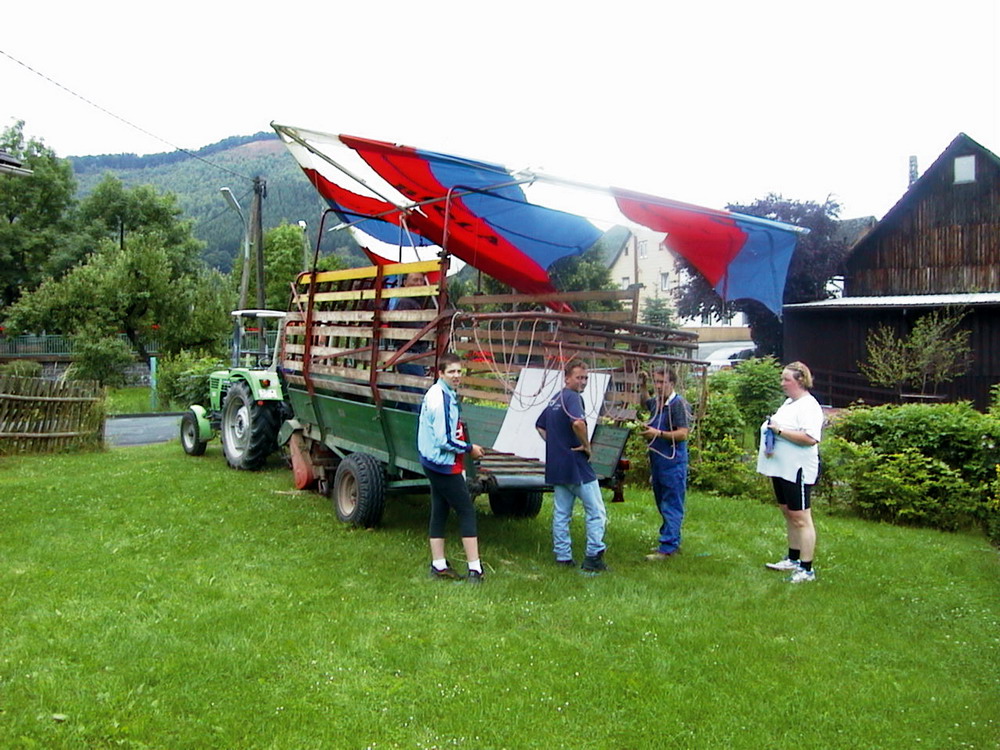 Es ging um das 100-jährige Bestehen der Burschensaft Schreiber. Hierzu waren auch die Drachen- und Gleitschirmflieger recht herzlich eingeladen. Wir waren sehr stolz darauf, hier mitmachen zu dürfen. Also trafen wir uns zu einer Besprechung, um ein Thema für einen Motivwagen für den Festzug, der am Sonntag aufgestellt werden sollte, zu beraten. |